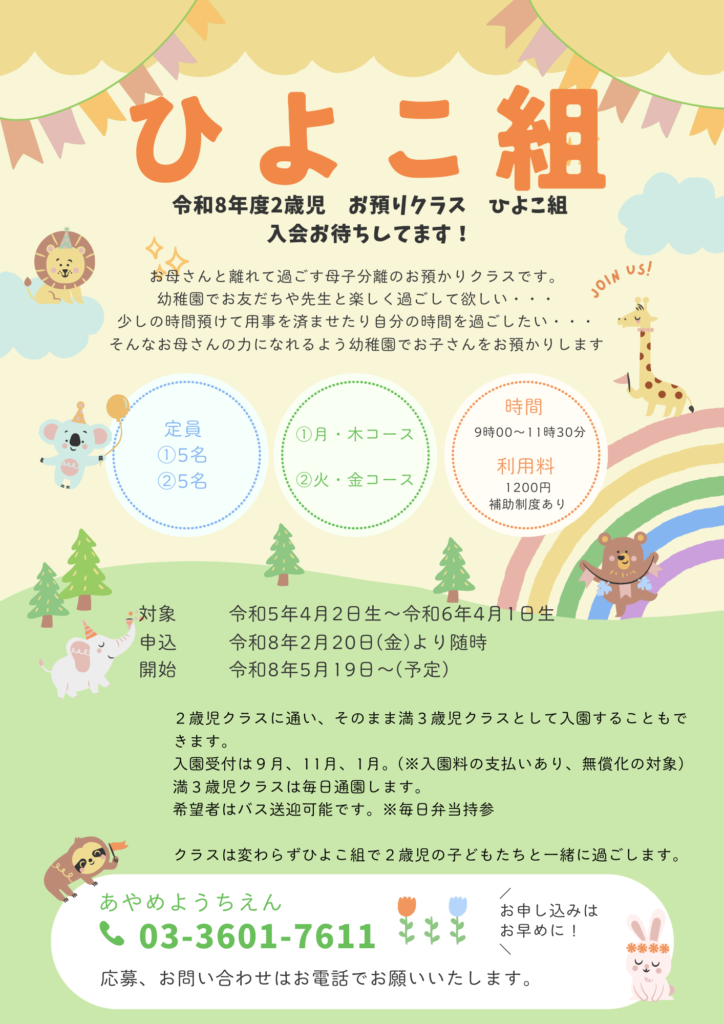 2026.02.09 お知らせ 2歳児 お預かりクラス ひよこ組 ひよこ組は、葛飾区の『家庭で保育する未就園児の定期的な預かり事業』を利用した お母さんと離れて登園する母子分離型のお預かりクラスです。 入会申し込みについては下記画像かこちらをご覧ください。